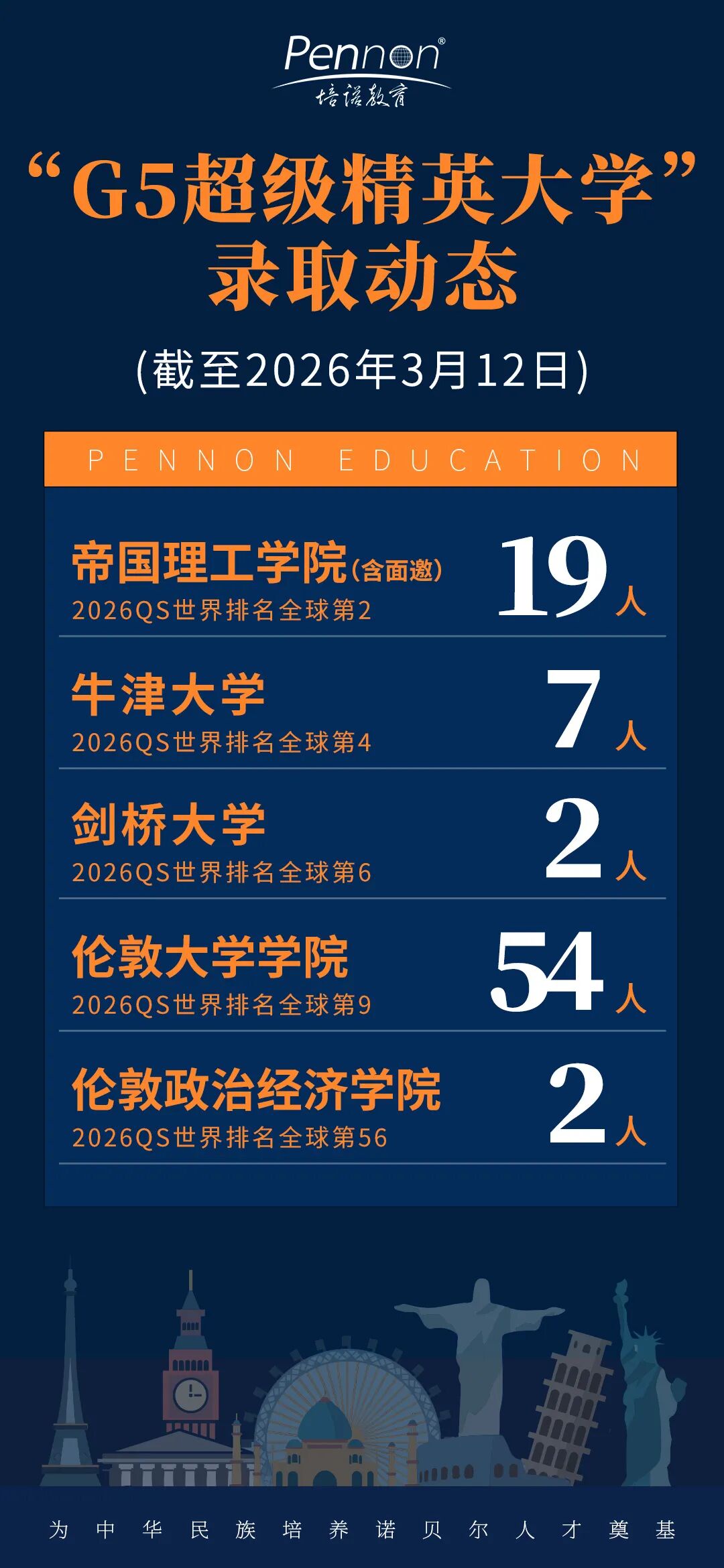 你要写【牛剑的厚重】:写7封牛津大学、2封剑桥大学的预录Offer。写少年们从15岁起就敢梦敢当的勇气。你要写【IC的硬核】:写19封帝国理工学院(IC)的面邀及预录,那些为了攻克笔试面试熬过的夜,最终都变成了帝国理工学院的入场券。你要写【UCL的广博】:写54封伦敦大学学院(UCL)的预录,这所最受中国学生喜爱的G5大学,再次向培诺学子敞开最广阔的怀抱。当然,还有【LSE的偏爱】:作为G5中录取最难、玄学最多的伦敦政治经济学院(LSE),今年的橄榄枝也终于伸向了培诺的优秀学子,2封预录抵达培诺。G5王者拼图正式完成!