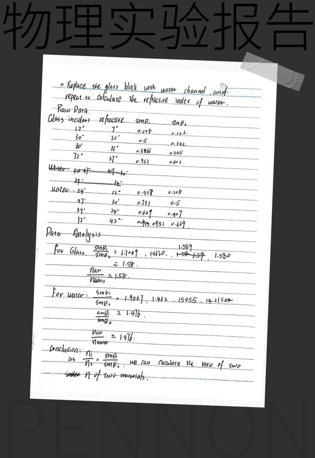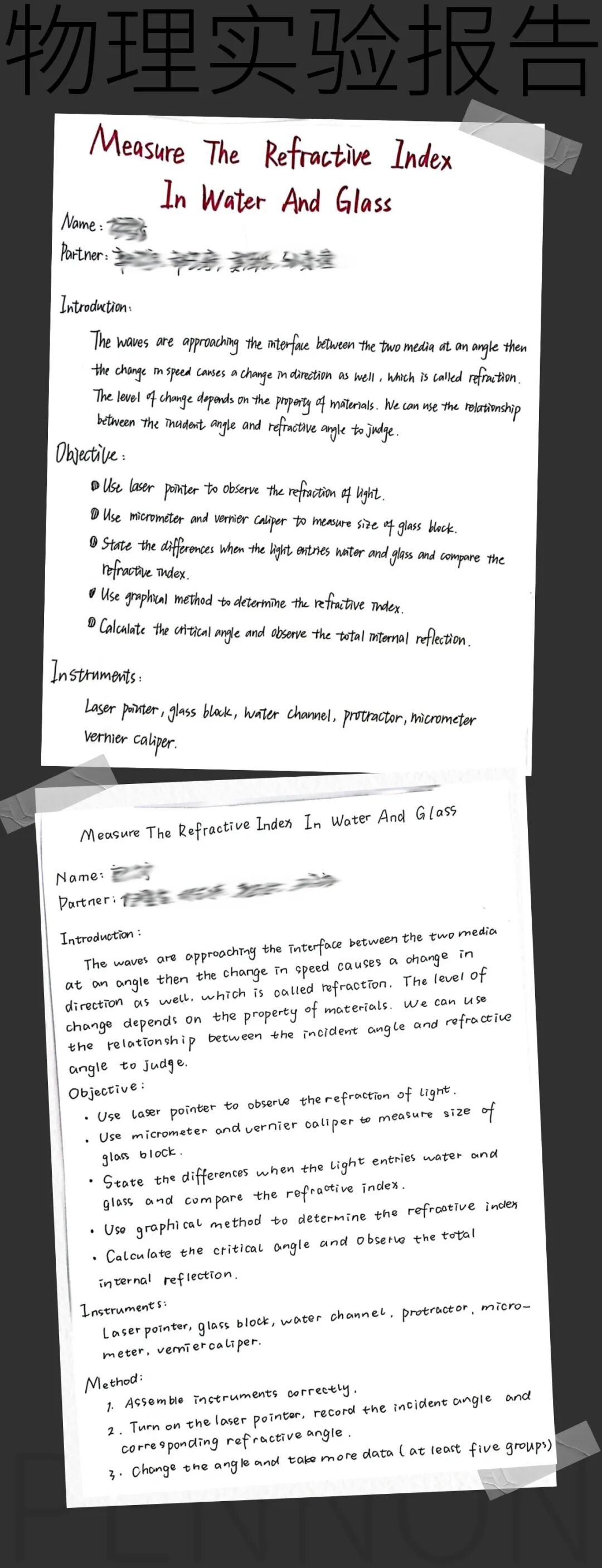 这是一次有趣的物理实验,探索光的折射变化。学生们的实验报告被要求全英文呈现,并准确记录实验的内容和结果。这样实践与理论的结合,让学生的知识架构更加清晰,在实践中践行理论,通过理论指导实践。